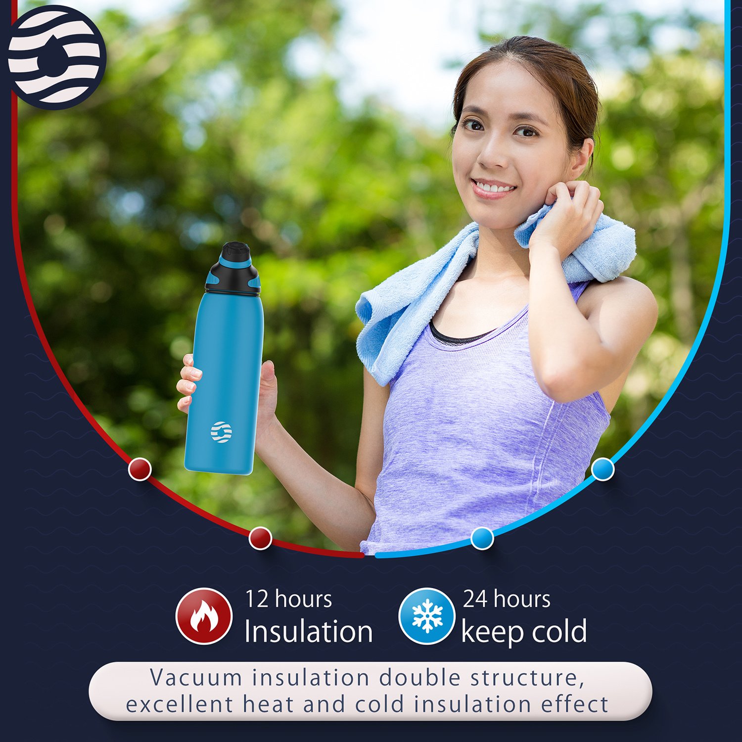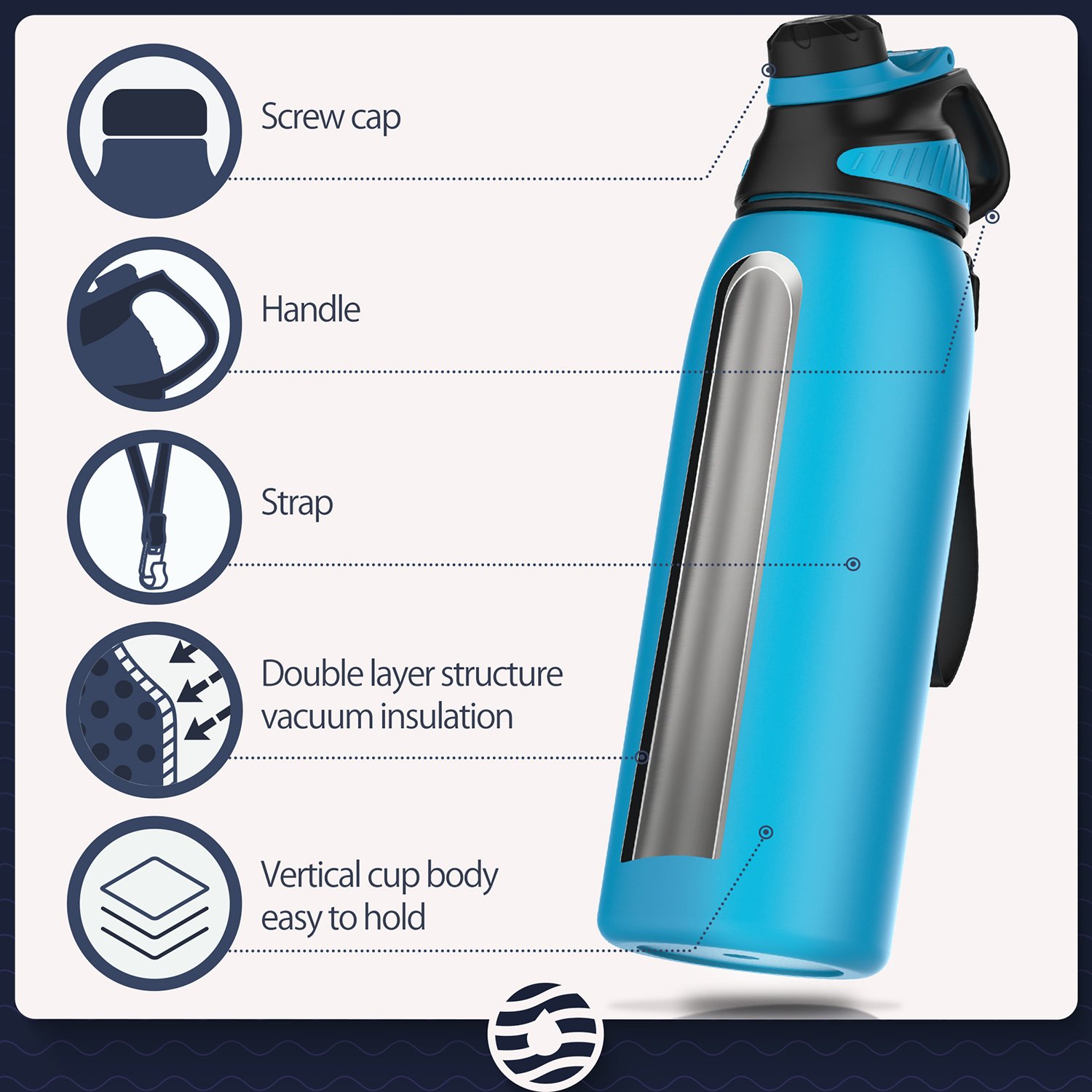 3.Insulated Water Bottle: Made from food-grade stainless steel, our BPA-free water bottle has a double wall design to keep drinks cold plus vacuum insulation & powder coating to keep it sweat-free & easy to grip.