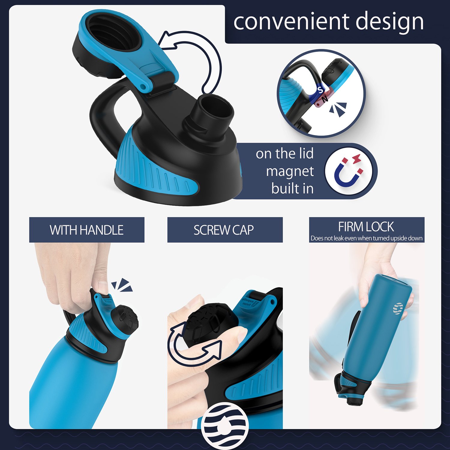 2.Smart Design of the lids - Ergonomic design of the lids makes it flow smoothly. Magnetic force lids will not fall back when drinking water.