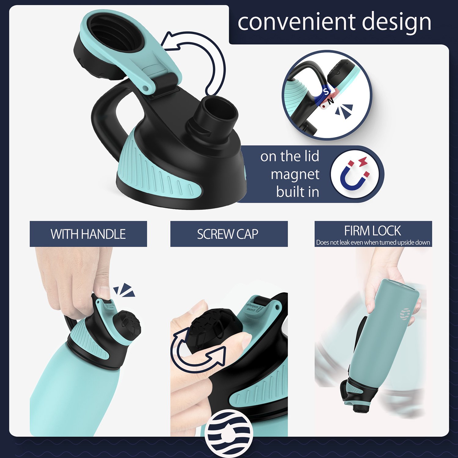 2.Smart Design of the lids - Ergonomic design of the lids makes it flow smoothly. Magnetic force lids will not fall back when drinking water.