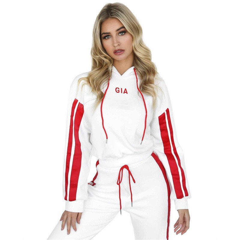 2 Piece Set Women Tracksuit Sportswear Casual White Red Sweat Pants Hooded Cropped Sweatshirt Hoodie