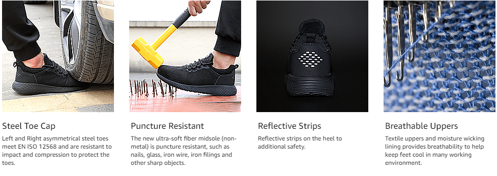 [SAFETY PROTECTION]Left and right asymmetrical steel clad head with ASTM F2413-18 I/75 C/75 rating to prevent heavy objects from smashing; soft Kevlar midsole to avoid puncture injuries from nails; glass and other sharp objects.